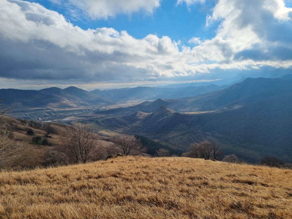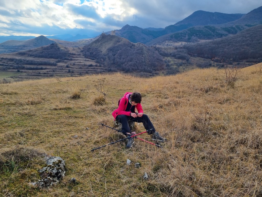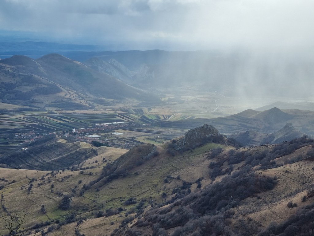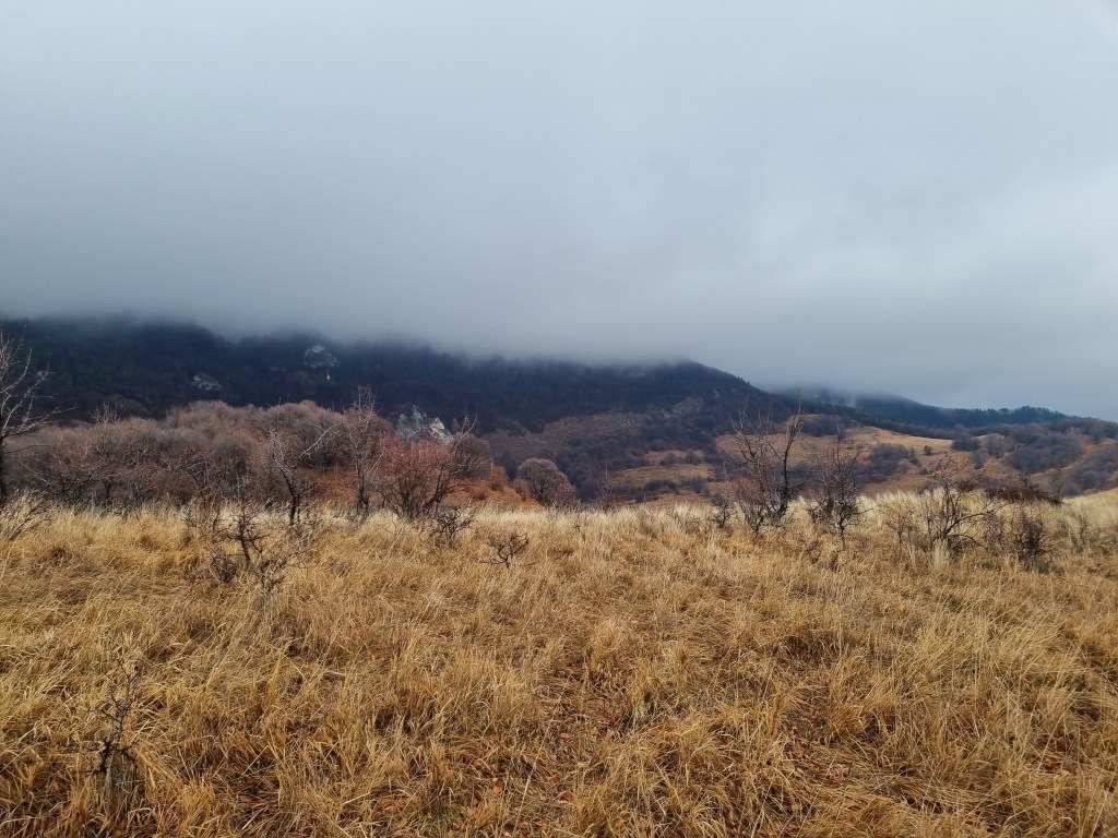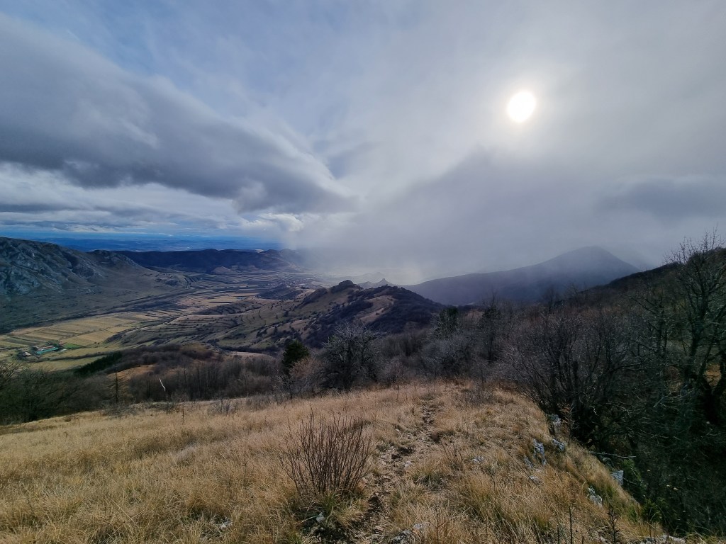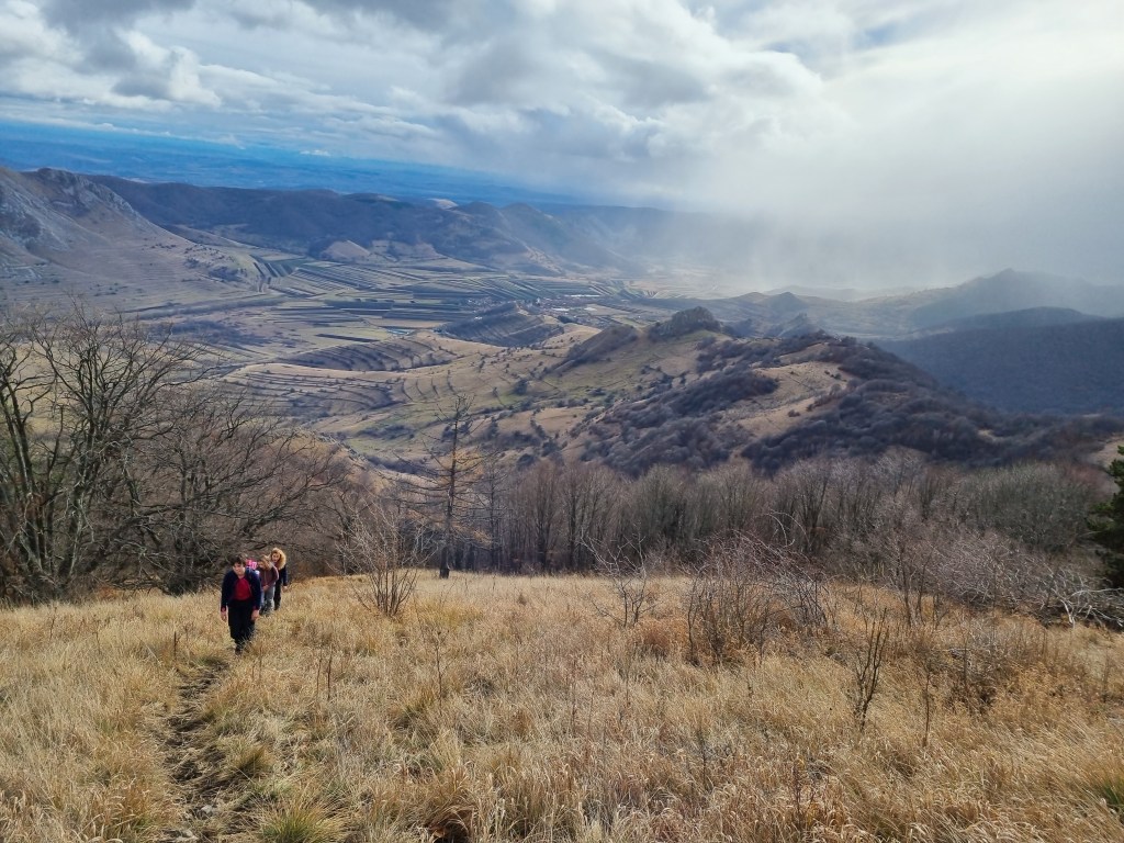 A doua încercare am făcut-o pe 29 noiembrie și a fost reușită. Prognoza meteo a fost mai bună și am ales același traseu, în circuit. Am pornit la drum întreaga familie, plus o prietenă a fetei. Am ajuns, tot așa, pe la ora 11 în Rimetea și ne-am apucat de urcat. În mod curios, un câine ne-a însoțit tot traseul. Vremea s-a înrăutățit pe măsură ce urcam în altitudine și sus pe creasta ne-a prins o ninsoare viscolită, din fericire, de scurtă durată. Cum bătea vântul, nu ne-am putut opri să mâncăm decât după ce am ajuns în spatele vârfului Ardașcheia, pe traseul marcat cu cruce galbena. Pozele spun povestea mai bine decât mine.