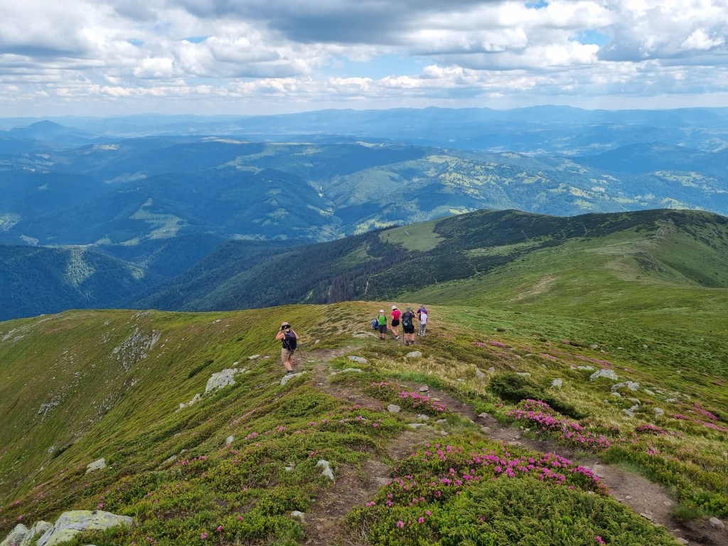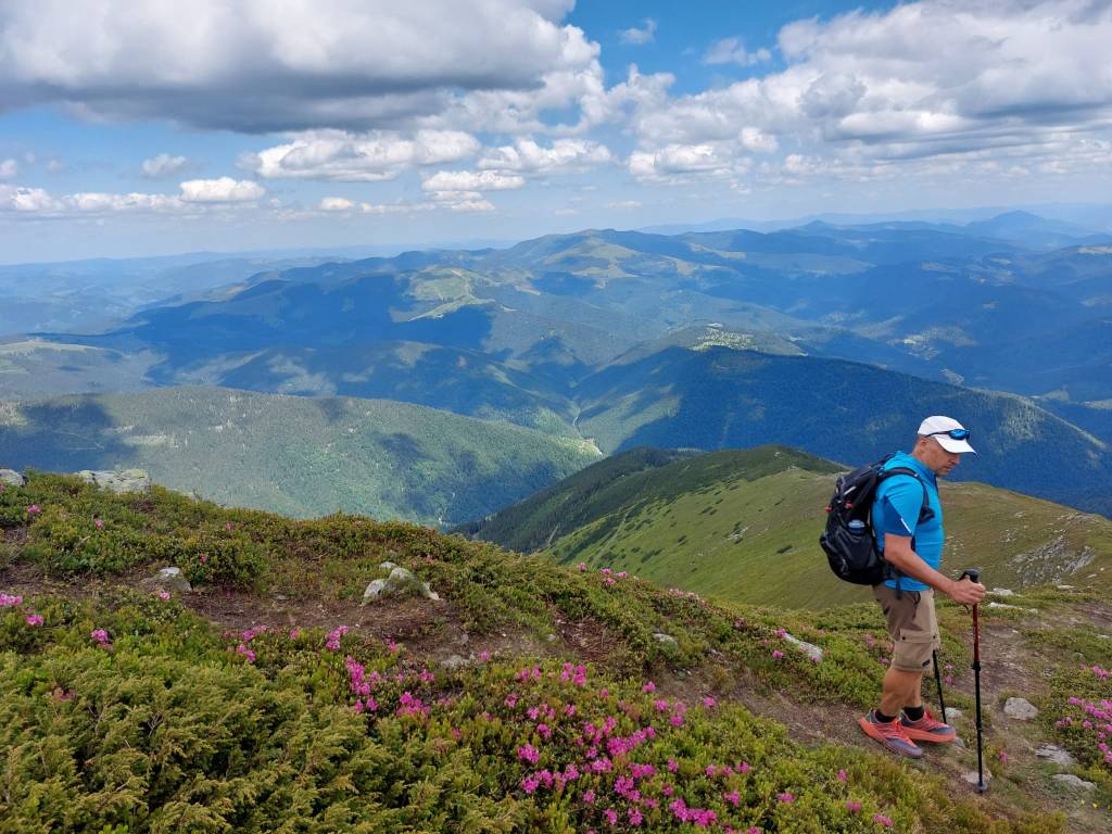 Iunie este sezonul rododendronilor în Rodnei și trebuie să mărturisesc că, deși am mai fost de câteva ori în zonă, nu s-a nimerit până acum să fie în sezonul lor de înflorire. De data aceasta însă am avut noroc și au mai fost câțiva înfloriți. Traseul merge pe creastă, nu ai cum să greșești, este foarte simplu de găsit și urmărit pentru că este în fața ta tot timpul. Primul vârf este Cobăsel (1835 metri), urmat de Vf. Roșu (2115 metri) și la o adică poate continua pe Ineuț (2222 metri) și Ineu (2279 metri). Traseul este permanent în urcare la dus și permanent în coborâre la întors. Cu această ocazie am aflat că respectivul vârf se cheamă Roșu din cauza culorii și abundenței florilor de rododendron. Noi am scurtat un pic traseul, dar este o variantă foarte abruptă, și am urcat pieptiș de la fost exploatare direct sub Vf. Cobășel, dar pe la cabana Diana traseul este ceva mai accesibil. De întors ne-am întors pe traseul turistic, la cabana Diana și apoi pe drum înapoi până la fosta exploatare. Au fost 14 kilometri cu 900 de metri diferență de nivel. Nu este foarte mult, dar nici puțin pentru copii de 10-12 ani. Este un traseu foarte este spectaculos din cauză că este permanent pe creasta deschisă, nu este împădurit deloc și dacă vremea este bună ai vizibilitate completă de jur-împrejur.