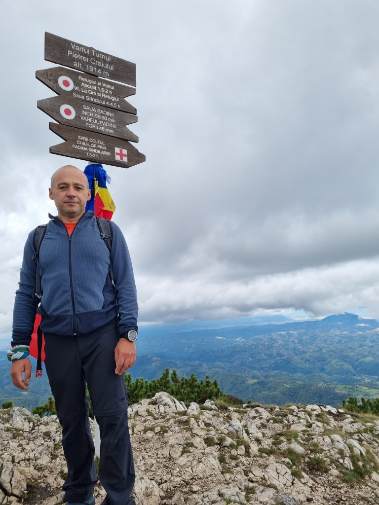 Vf. Turnu (1914 m) este primul dintre cele care alcătuiesc creasta Pietrei Craiului si cel mai nordic. Priveliștea de aici este fantastică, fiind de aproape 360 grade. Creasta este foarte îngustă, dar practicabilă dacă ai grijă, cel puțin pe porțiunea parcursă de noi. Cea mai mare problemă era vântul puternic, care bătea din vest ( de către Făgăraș ca și punct de reper). Atunci când nu erai ferit de creastă trebuia să ai grijă să nu te dezechilibrezi sau să nu scoți lucruri din buzunare. Priveliștile merită din plin efortul, dar nu am putut să ne bucurăm mult de ele din cauza vremii instabile, care ne tot împingea de la spate să coborâm la altitudini mai mic. Am continuat pe creastă până la Padina Popii, cred ca este mai puțin de un kilometru, de unde am coborât la Cabana Curmătura pe marcajul cu linie albastră. Nu poți greși, pentru că alt marcaj de coborâre nu mai este, afară de cel cu punct roșu care marchează creasta. Coborârea este abruptă, cu mult grohotiș, cu priveliști superbe către Bucegi și cu binevenita Cabana Curmătura ca punct final. De data aceasta ne-am delectat cu ciorbă de legume și sandwich-urile de acasă. La propriu de acasă pentru că erau aduse de la Cluj.