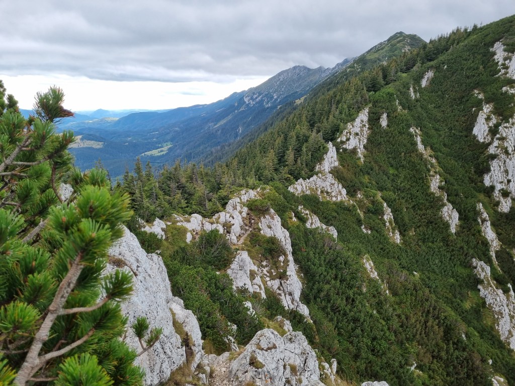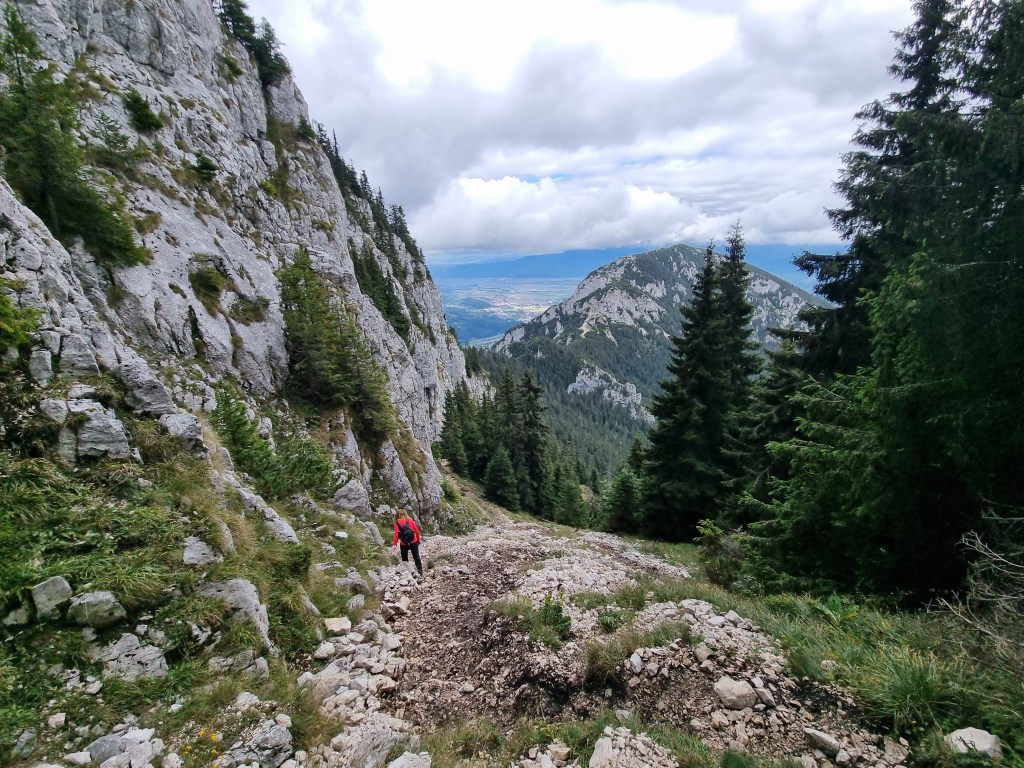 Cabana Curmătura merită o mențiune specială pentru că este o mică bucată de Austrie, dar mai sărăcăcioasă . Poate că nu este chiar așa, dar în acel moment de oboseală, pentru noi așa a părut. Este curată, îngrijită, cu un meniu simplu, dar care conține lucruri esențiale și corecte ca preț. Am luat o cafea mare care ne-a mai ridicat moralul așa că am decis să schimbăm planul și sa fim mai curajoși, chiar dacă vremea era instabilă. Practic, creasta era acoperită de nori in acel moment, dar meteoblue ne asigura că nu o să ploaie. Plini de elanul proaspăt regăsit, am urmat marcajul cu punct roșu care duce către Vf. Turnu. Cărarea devine mai dificilă tehnic, o indicație că lucrurile se schimbă și că urmează lucruri serioase. După ce ne-am despărțit de marcajul galben care ar fi dus pe Piatra Mică, nu a durat mult, și am dat de primul cablu. Cablul este pus acolo să te ajuți de el să treci porțiunile dificile. Dificil înseamnă vertical și fără puncte de prindere. Chiar și dacă ar fi puncte de sprijin, tot vertical rămâne. Cam pe aici am prins din urmă alți doi drumeți, care ne-au convins să mergem mai departe, pentru că altfel ne cam bătea gândul să renunțăm. Motivele erau mai multe, vremea instabilă, norii de pe creastă, distanța de parcurs pe creastă până la Padina Popii, și chiar primul cablu de care am dat. Acesta urcă o porțiune verticală de câțiva metri și dispare după muchie, fără a oferi nici o indicație a ce urmează mai departe. Sigur, pe hartă am văzut ca urcarea devine foarte abruptă, dar cam atât. Stând acolo, în fața cablului, nu poți să presupui nimic, așa că este un moment psihologic important, sau mergi mai departe, sau te întorci. Unu dintre cei doi mai fusese pe traseu, așa că ne-a lămurit că este cea mai rea porțiune, de fapt a doua cea mai grea și că urcarea devine ceva mai ușoară și mai asemănătoare cu o cărare. A fost imboldul de care aveam nevoie ca să continuăm. Tot ce pot să spun este că aceasta porțiune de urcare până aproape de Vf. Turnu nu este pentru cei fricoși sau cu rău de înălțime (eu unul am așa ceva). Tot urcând am realizat brusc că dacă plouă, așa cum amenința vremea, este aproape imposibil să faci traseul la vale, așa că orice ar fi, trebuie să continuăm.