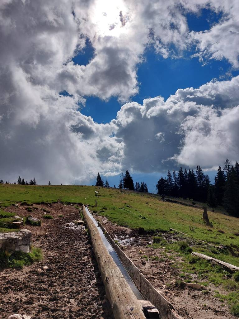 Noi ne-am făcut plinul cu apă de la izvor, dar sunt oricum și altele mai sus pe traseu dacă uitați și am început să urcăm. Urcarea este foarte abruptă, mai ales în partea de jos, și până către Șaua Zănoaga nu are nimic deosebit. Din acest motiv nici nu am făcut multe poze pe această porțiune. Abia când urci în altitudine mai serios, către stâna Zănoaga, o să înceapă să se deschidă priveliști spectaculoase și vei vedea creasta îngustă a Pietrei Craiului și Munții Bucegi. Odată trecuți de stână am dat de intersecția dintre marcajul galben pe care venisem și care duce la Cabana Curmătura și cel cu cerc albastru care duce către Vf. Piatra Mică. Obosiți de noaptea de nesomn și de urcuș, am abandonat de comun acord traseul original către Vf.-ul Piatra Mică și am continuat către Cabana Curmătura. Ne doream amândoi, mai mult decât orice, o cafea.