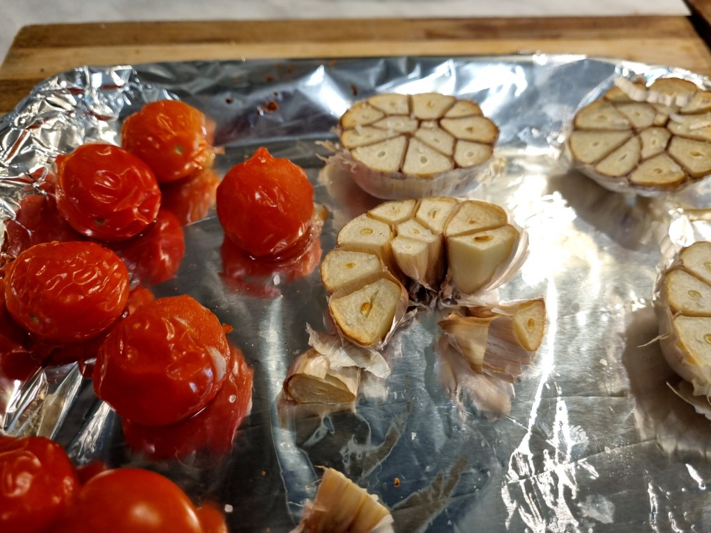 Pentru decor am pus la cuptor, 15 minute la 160 de grade, usturoi și roșii cherry. Usturoiul trebuia stropit cu ulei de măsline, dar din motive de dietă am evitat acest aspect. Usturoiul copt are un gust aparte și se poate pune în cam orice mâncare, inclusiv în omleta de astăzi.