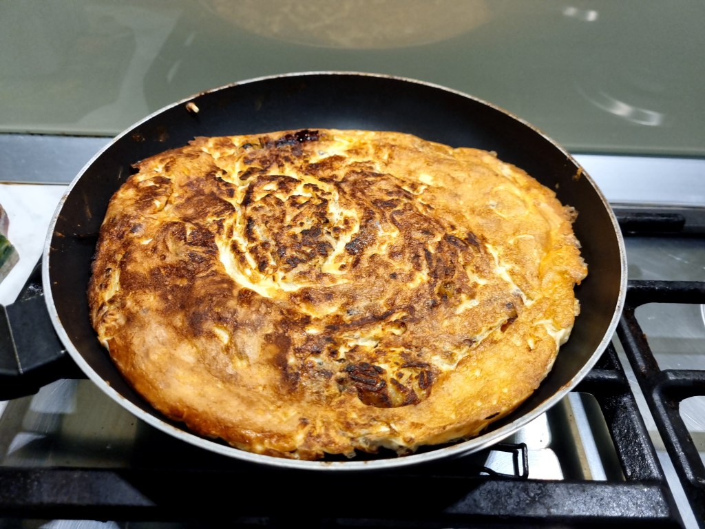 Se începe cu cartofii care se curăță de coajă și se rad. Ceapa se taie cum o fi, eu am preferat fâșii mai lungi, dar depinde de voi. Se pun cartofii și ceapa la prăjit, într-o tigaie anti aderentă, cu puțin ulei de măsline. Se vor prăji întâi la foc mare, apoi la foc mic, pentru că vrem să se înmoaie.Se condimentează cu sare și piper sau cu ce mai vreți voi. Ouăle, albușul și parmezanul se bat ca pentru omletă și se condimentează. După ce cartofii și ceapa se înmoaie se adaugă în tigaie ouăle. Se amestecă bine pentru a avea o compoziție omogenă apoi se lasă la foc mic. Ideal al fi să obținem o omletă care să arate ca și o plăcintă rotundă. Pentru asta nu vom amesteca după omogenizare și vom pune capac. După ce se face pe o parte, adică se desprinde ușor de tigaie dacă încercăm să o ridicăm, trebuie întoarsă. Eu am făcuta asta direct prin mișcarea tigăii, dar dacă nu aveți experiență puteți folosi capacul.