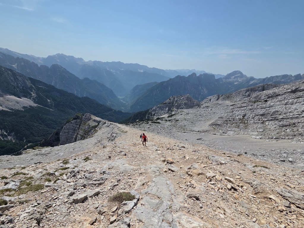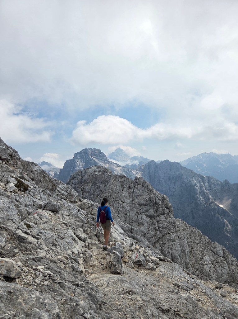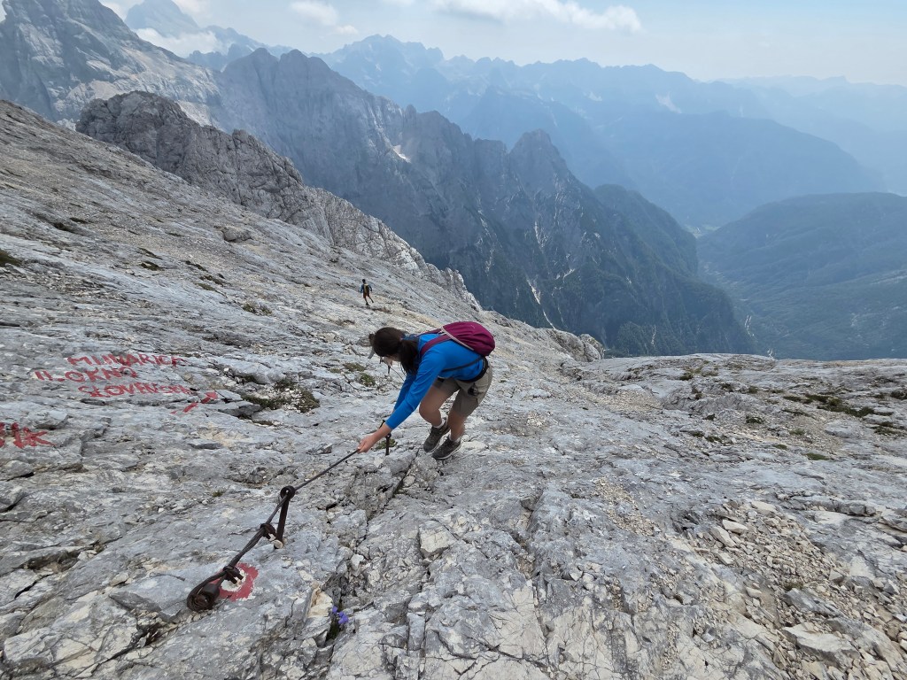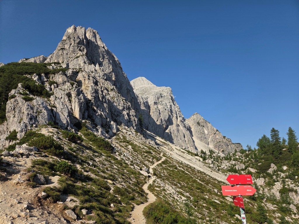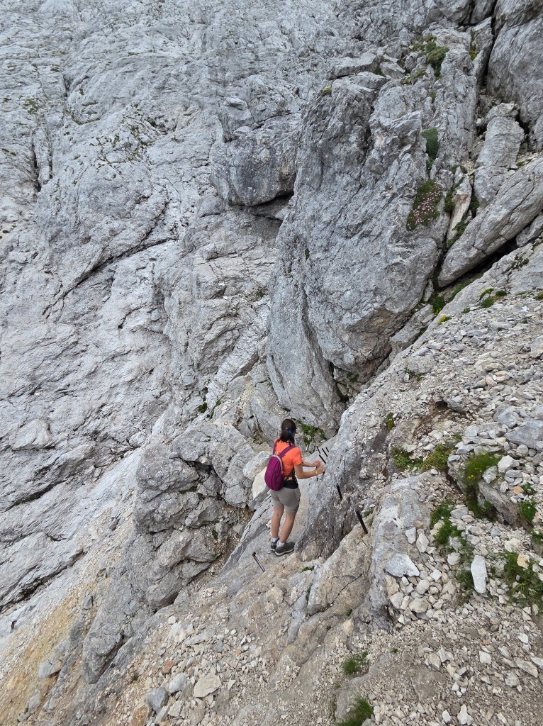 Primul vârf urcat a fost Prisank (2547), este pe partea stângă cum urci în pas, și de jos arată ca un perete vertical. Sunt mai multe variante, noi am ales-o pe cea mai ușoară, fără via ferrata. Cărarea merge de fapt prin spatele masivului așa cum este văzut din parcare. Marcajele sunt aproximative, nu foarte clare, este bine de consultat Mapy la început de traseu, apoi mai pe final devin clare. Cărarea pe care am urmată se cheamă Slovenska pot. Celelalte variante presupun urcare pe via ferrata, doar că un panou de la bază te avertizează că de fapt nu este o via ferrata, cât anumite porțiuni mai periculoase sunt asigurate cu lanțuri. La început cărarea nu este foarte abruptă, seamănă ca aspect general cu cea care duce la Negoiu de la tunel, dar după ce dai roată pe după masiv începi să întrevezi exact cât de abrupt devine. Ultima porțiune, la peste 2000 metri, este complet lipsită de vegetație, este abruptă și deși unele porțiuni scurte sunt asigurate, mai sunt treceri periculoase. Nimic de nefăcut, dar pentru mine, care am fobie de înălțimi, nu cărarea și cățăratul peste stânci îmi dau emoții, cât prăpastia care se cască sub tine aproape permanent. Odată ajunși în vârf a fost ceva mai bine, este spațiu suficient, majoritatea au venit de pe partea cu via ferrata, dar cineva mi-a spus că de fapt nici nu o folosit echipamentul, că panoul avea dreptate, cablurile mai mult asigură porțiunile expuse și că este foarte dificil. Coborârea a fost interesantă, am coborât e același traseu, dar este practicabilă dacă se merge cu grijă. Odată ce ajungi la zonele cu vegetație, se revine la cărarea care seamănă cu cea din Făgăraș și este mai ușor. Toată tura a avut 11.5 km cu ceva peste 1000 de metri diferență de nivel și ne-a luat cinci ore de mers efectiv. Nu este neapărat o tură lungă, dar nici scurtă, și nu sunt izvoare pe traseu.