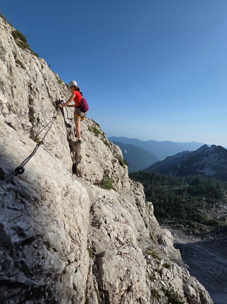 A treia zi, și ultima, am mers pe Mala Mojstrovka (2333 m). Se pornește tot din pasul Vrsic și sunt două variante. Se poate merge fie pe cărarea cu via ferrata fie pe cea fără. Noi am ales să urcam pe via ferrata și să facem un circuit venit înapoi pe cea fără. Nu suntem mari experți in via ferrata, avem echipament, dar am socotit că fiind B/C nu poate fi foarte grea. Prima surpriză o ai când ajungi la baza peretelui vertical pe care trebuie să urci și vezi cum se prezintă stânca. Cea mai dificilă urcare asigurată făcută până acum a fost cea din Cheile Turzii, dar aceasta arăta mult mai abruptă. După ce am început să urcăm nu a fost foarte rău, bucățile asigurate cu cablu nu sunt extrem de dificile, problema reală este că urci în zig-zag pe un perete vertical de vreo 300 de metri și există porțiuni expuse și neasigurate cu cablu. Practic via ferrata nu este o linie continuă, mai trebuie să faci și treceri, care ar fi practicabile, oarecum, dacă nu ar fi prăpastia permanentă de sub tine. Nu mai are rost să zic că s-a activat frica mea de înălțimi, recunosc că îmi tremura mâna atât de tare încât mi-a fost frică să scot telefonul, doar faptul că după noi urcau două persoane în vârstă m-a făcut să prind curaj și să continui. Poate și faptul că era mai greu de coborât, decât de urcat, a ajutat. Pe la jumătate am pățit o chestie urâtă, în sensul în care a venit o avalanșă de pietre de sus( este genul de rocă friabilă și în consecință sunt multe pietre desprinse peste tot), am avut noroc că a trecut prin stânga noastră cu vreo 50 de metri, dar oricum a fost foarte neplăcut și ne-a arătat cât de ușor o poți păți. Ne-a cam tăiat cheful la amândoi, am așteptat oricum până grupul entuziast de tineri din față au trecut peste o cornișă și au ajuns pe o partea a traseului care continua lateral fața de peretele vertical, pentru a elimina riscul unei noi căderi de pietre. Am ajuns si noi la capătul peretelui și de aici e foarte simplu. Te descurci cum poți, că via ferrata se termină. Există marcaj, dar continuarea traseului presupune traversarea unei zone de grohotiș pentru a ajunge la un nou abrupt, care trebuie urcat fără asigurare. Nu este atât de greu, dar nici ușor, și ajută mult că nu mai vezi prăpastia de sub tine. Dacă cazi este la fel de fatal, doar că te sugestionezi tu că nu este. Odată ajunși în vârf am răsuflat ușurați, dar trebuie să recunosc că a fost un efort mai degrabă mental decât fizic. Trebuie, am constatat eu, avut grijă cu descrierile traseelor prin Slovenia, pentru că, din experiența mea, în realitate sunt mai periculoase decât în teorie. De întors, ne-am întors pe cărarea normală, nu este dificilă, doar enervantă, pentru că merge prin același grohotiș depus în strat subțire peste stâncă și cum sunt niște pietre cu forme rotunde, se alunecă foarte tare, mai ales că pe prima jumătate a coborârii cărarea este mai free style ( tot expresie a fetei). Adică cum și pe unde poți, trebuie să ajungi la un colț al peretelui vertical din stânga ta și de acolo cărarea cotește brusc la 90 de grade pe sub abruptul deasupra căruia te strădui să nu patinezi. Priveliștea însă merită efortul, se vede bine și vârful Prisank, urcat de noi cu două zile în urmă, și exceptând partea cu via ferrata este o drumeție mult mai accesibilă decât prima. Noi am făcut, cu totul, 5.5 kilometri cu 700 de metri diferența de nivel. Nu zic să nu încercați această variantă, doar să fiți pregătiți mental că vor fi secțiuni care de fapt nu sunt asigurate, sau poate înțeleg eu greșit conceptul de via ferrata.