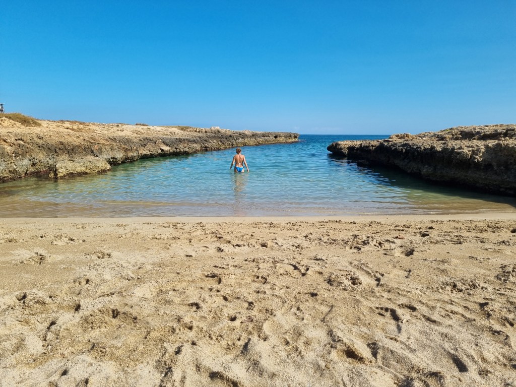 Inițial pentru a șasea zi am avut planificat să mergem in Brindiși, dar am considerat că este prea departe și am hotărât să mergem la plajă dimineața, in Ostuni la amiază și la o alta plajă după masa, undeva mai aproape. A fost ziua plină de întâmplări fericite într-o excursie care a stat oricum sub semnul întâmplărilor fericite. Prima plaja aleasă se cheamă Costa Smeralda și care s-a dovedit o înlănțuire de mici golfuri stâncoase, fiorduri in miniatură, din care unele aveau nisip la capătul unde se intra in apă. După cum arătau bănuiesc că unele au fost și adaptate pentru a scoate bărcile de pescuit din apă pentru că pe margini se vedeau urme de prelucrare cu unelte mecanice. Fară un motiv am mers cu Google maps, nu cu Waze și ne-a dus chiar la un golf cu nisip. Am nimerit acolo dimineața, când mai erau doar două cupluri și pană la amiază a mai apărut doar un grup de pensionari. Ce am admirat in general in Italia la persoanele in vârsta este ca se îngrijesc și se respectă. Poate că conduc mașini vechi și stau in case mici, dar se îngrijesc, se îmbracă frumos și se plimbă. Revenind, in comparație cu plaja stâncoasă și agitată din Polignano, locul părea ireal de liniștit, iar apa era din nou caldă si transparentă. Unde am stat noi nu era plaja amenajată cu umbrele și șezlonguri dar dacă mergeai un pic pe drumul de pe țărm puteai găsi și locuri amenajate. Pentru doua ore am considerat ca nu este necesar. Mijlocul zilei l-am petrecut in Ostuni, un oraș alb cocoțat pe un deal , la vreo șapte kilometri de mare. Centrul istoric este frumos, cu nelipsitele biserici și clădiri zidite din piatră albă. Ce îl diferențiază de altele este amplasarea lui pe deal și faptul că poți privi in depărtare sau îl poți privi de la depărtare, după caz. In rest aceleași străduțe înguste, in pantă de data aceasta și același amalgam de turiști și localnici. Nu o spun ca pe ceva rău, doar ca deja era ziua șase și poate Ostuni ar fi trezit mai mult interes in noi dacă era vizitat in prima zi.