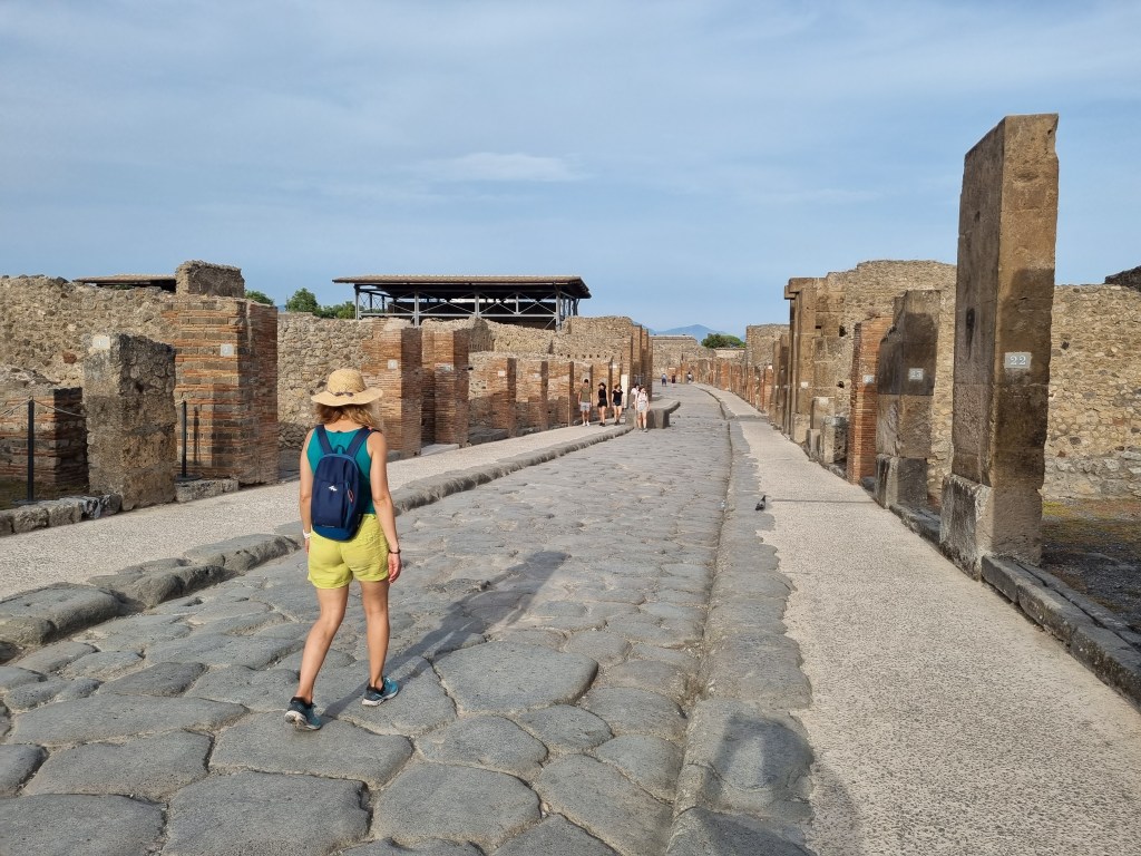Noi am vizitat prima data Pompei, pentru ca așa a ieșit din calculul de timp ad-hoc făcut in a doua zi. A fost interesant dar și mult de umblat pe jos pe o căldura năucitoare. Cum nu exista decât putină vegetație in incintă pietrele închise la culoare se încălzesc excesiv de mult. Pentru mine Pompei reprezintă o odă a măiestriei urbanistice romane, de mult apuse cred, pentru că acum este fără toalete și alte facilitați moderne. Exista un singur bar dotat cu toaletă cam pe la mijlocul perimetrului, nemarcat pe hartă, peste care am dat din întâmplare. Bine, nu chiar din întâmplare , căci am văzut pe cineva cu o înghețată și m-am gândit că nu poate fi departe magazinul. Dar după cum miroase pe la colturi și după șervețelele de pe jos bănuiesc totuși că multă lume nu îl găsește la timp. Biletul de intrare este 16 euro, nu vă lăsati vrăjiti să cumparați ghid audio pentru că găsiți totul on-line. Ai grija să ai baterie in telefon .Noi am pornit fără să avem măcar o banală hartă, cu bateria pe sfârșite in telefon și având doar apă la noi. Ne-a luat cinci ore și mulți kilometri, dar l-am văzut cam pe tot chiar dacă ne-am ghidat după o poză facută după harta unui alt turist. Pe final s-a descărcat și harta on-line dar deja era tardiv. Eu va sfătuiesc să îl vizitați chiar dacă nu îl puteți bate la pas pe tot, pentru că merită văzut cum era amenajată o tavernă, un bordel sau o casă romana. Aș aprecia că, dacă scoți tehnologia noastră mult evoluată din ecuație, orașul nu diferă foarte mult de unul modern decât prin lipsa cronică a vegetației stradale.